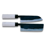 Introducing the Handmade Ginza Steel Knife Set, comprising a 165mm Santoku knife and a 165mm Nakiri knife. Meticulously crafted by skilled artisans in Ginza, Japan, these knives feature Blue #2 Soft Iron Blades renowned for their exceptional sharpness and durability. The Santoku knife offers versatility in slicing, dicing, and chopping, while the Nakiri knife excels in vegetable preparation. Enhanced with ergonomic handles and traditional craftsmanship, this set epitomizes Japanese culinary tradition. Elevate your cooking journey with knives that seamlessly blend artistry and functionality.