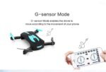 main characteristics: ● easy to be put in your pocket-6.5×14.5×3 cm (folded), 15.5x15x3 cm (unfolded) ● 720P resolution WiFi camera with adjustable angle gives access to clear FPV and control ● Air Press Altitude Hold maintains the flying drone at the same height for smooth planes ● Headless Mode allows you to ignore the orientation and pilot the quadcopter freely ● G-sensor Mode allows the drone to move according to the movement of your phone ● Plug-in 3.7V 500mAh lithium-ion battery for 6 to 8 minutes of flight