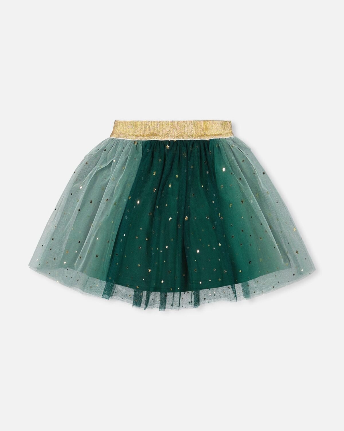 Our Mesh Skirt With Bow Forest Green is made for twirling through the magic of the season. This pleated mesh skirt features a soft ombré fade, a glittery allover star print, and a gold elastic velvet waistband with a statement bow. Pair it with any top or sweater from our “The Magic Of Xmas” collection for a festive look that shines.