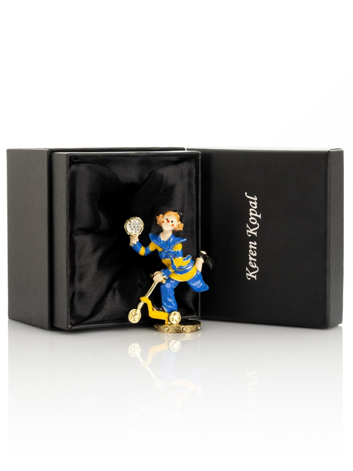This exquisite trinket box by Keren Kopal features a whimsical clown dressed in a vibrant blue and yellow costume, joyfully riding a golden scooter while playfully tapping a jeweled drum. Every detail is expertly hand-painted and adorned with sparkling crystals, making this piece a delightful collectible and conversation starter for art lovers and collectors alike. Crafted with superb materials and plated accents, it captures the charm and artistry for which Keren Kopal creations are renowned.